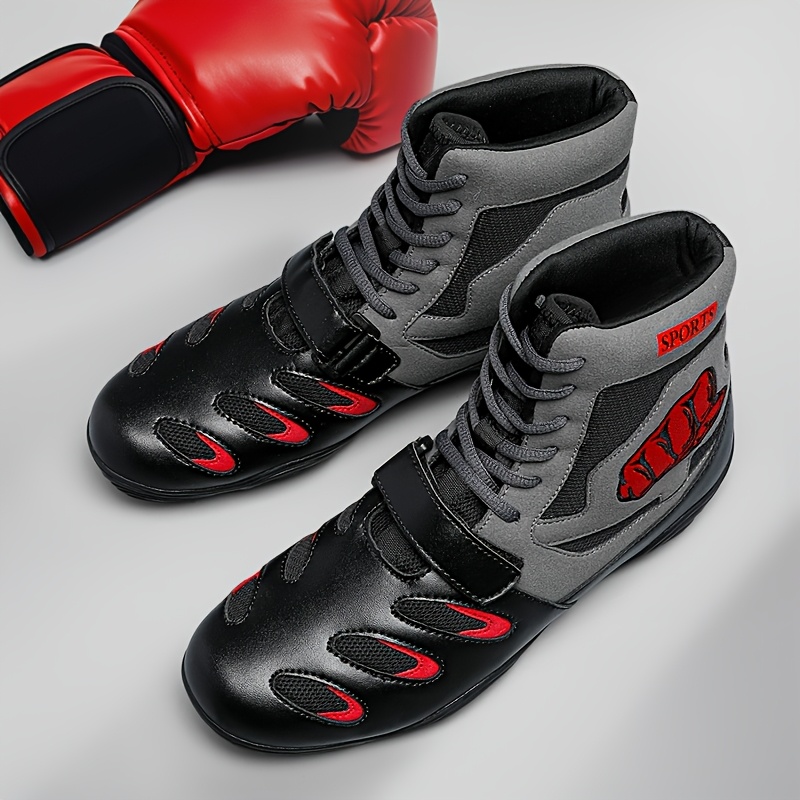 [Boxing Shoes] Breathable High-Top Boxing Training Shoes | Non-Slip Rubber Sole, Lace-Up Sports Boots for Gym & Martial Arts - Black with Red Accents